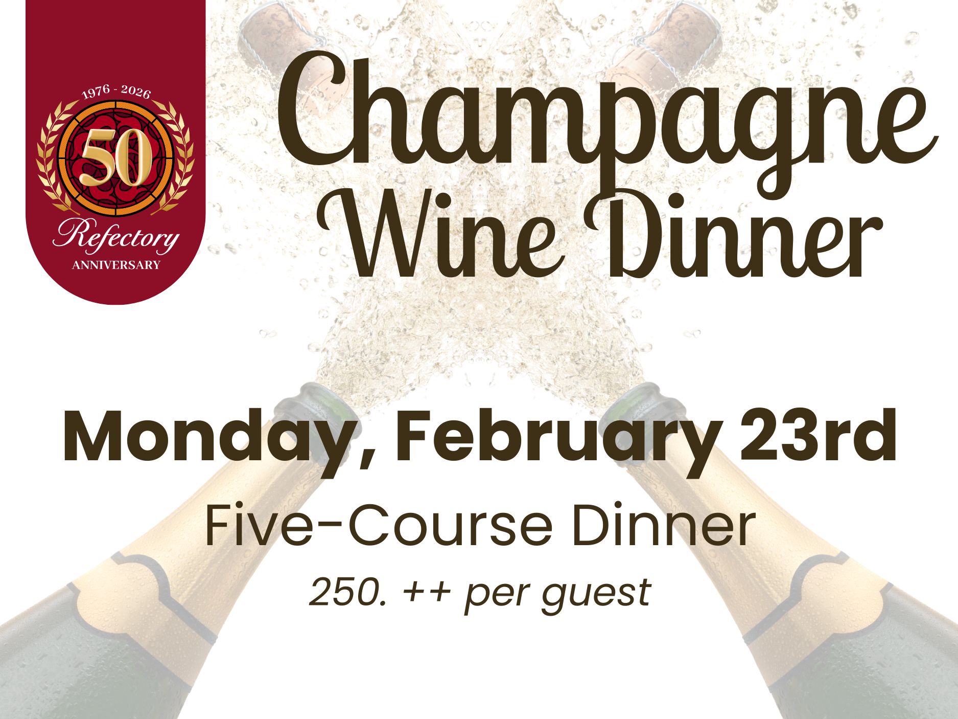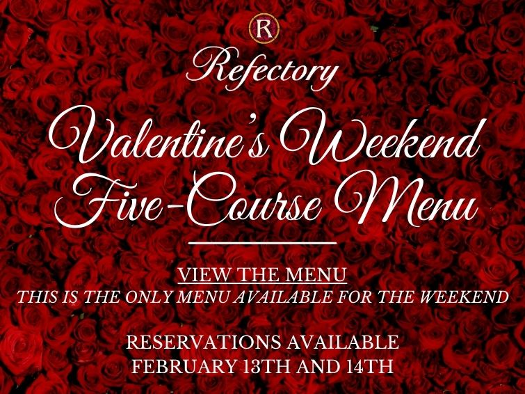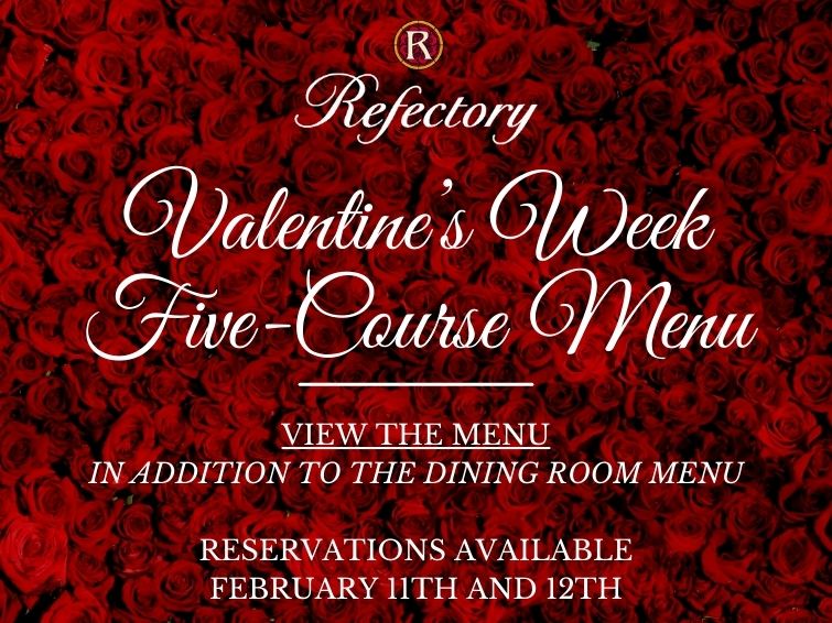 The Refectory has two completely private rooms which can accommodate groups of six to sixty for banquets, private luncheons, hors d’oeuvre receptions, and personalized wine tastings.