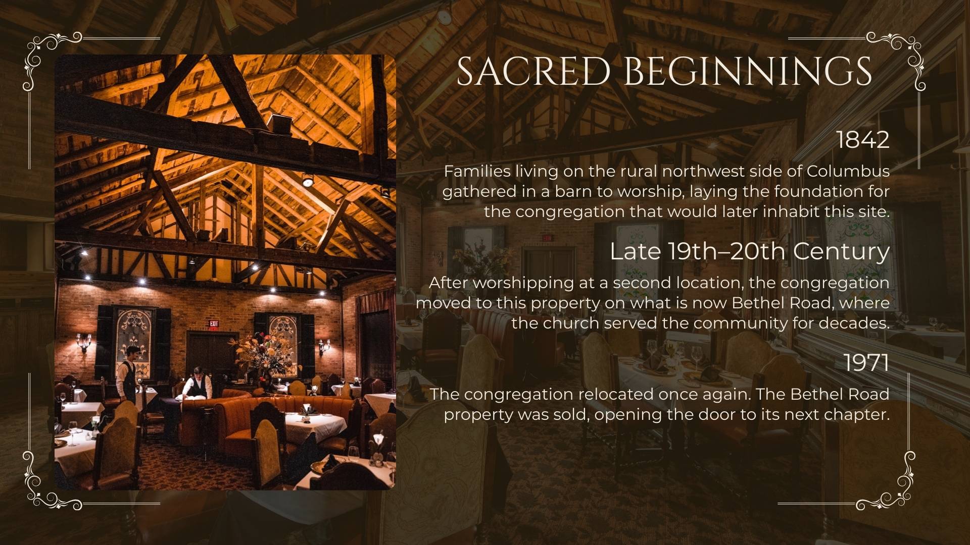 What began in a restored 19th-century church has grown into a place where generations have gathered — to celebrate milestones, share meaningful meals, and create lasting memories. Our 50th Anniversary year is a tribute to the guests, associates, mentors, and community partners who have shaped our story.