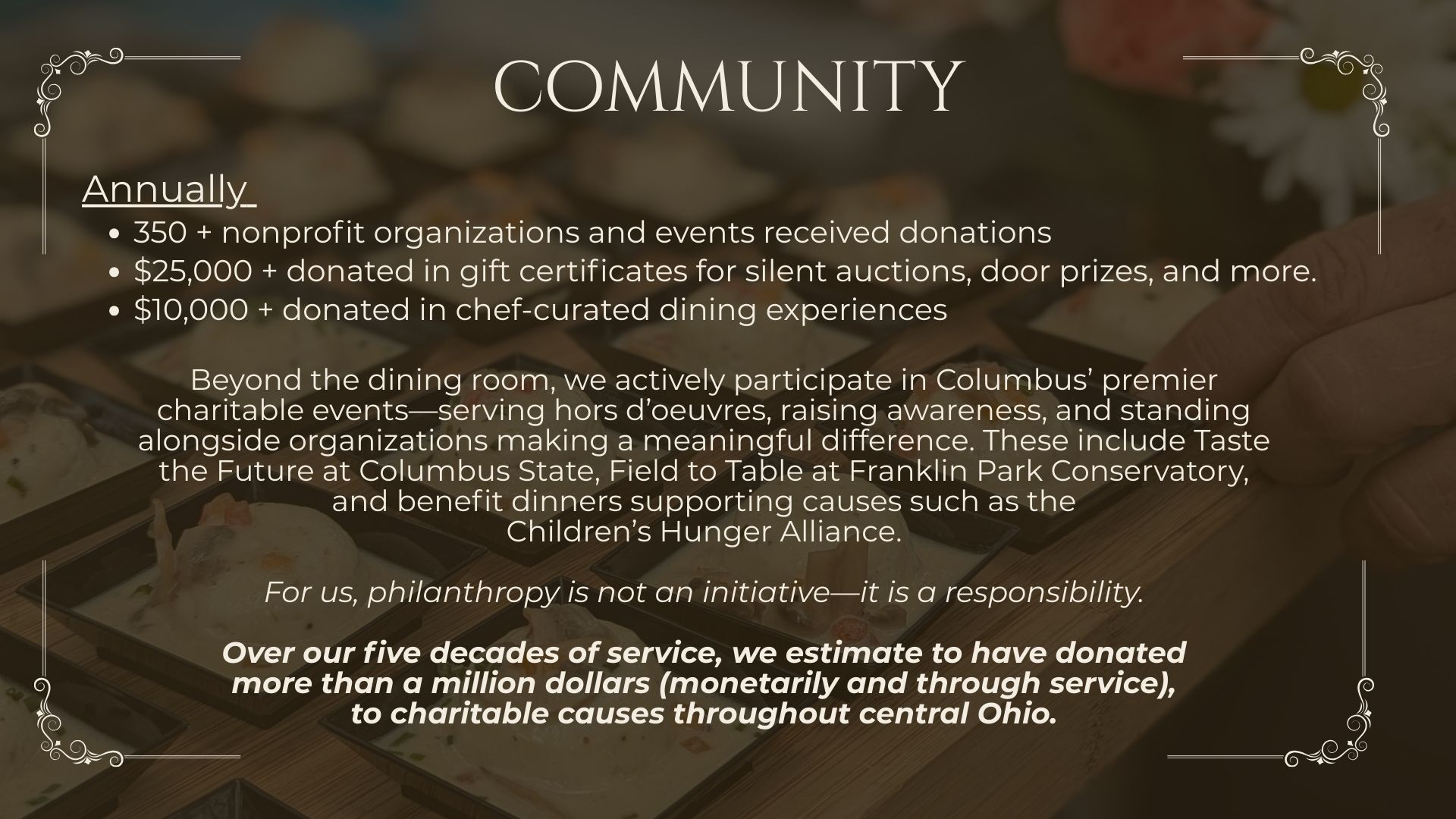“It is an honor to create culinary experiences for our guests. Much of life is experienced over food–engagements, anniversaries, milestones, and important conversations. Our guests have been gracious enough to allow our offerings to enhance those experiences on every level.”
