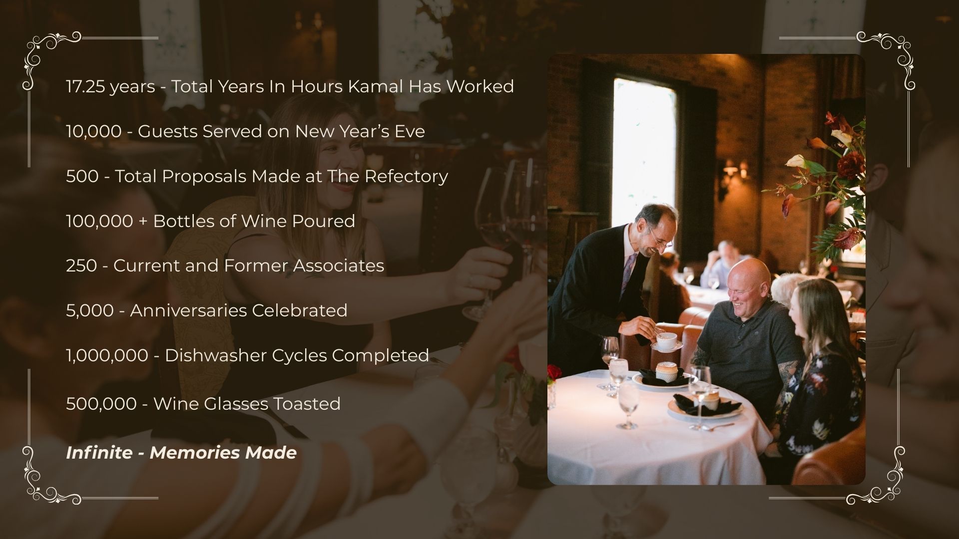 “The Refectory has always been about more than food. It’s about relationships—within our family, with our staff, and most importantly, with our guests. This anniversary is our way of saying thank you to the people who have made The Refectory part of their lives.”