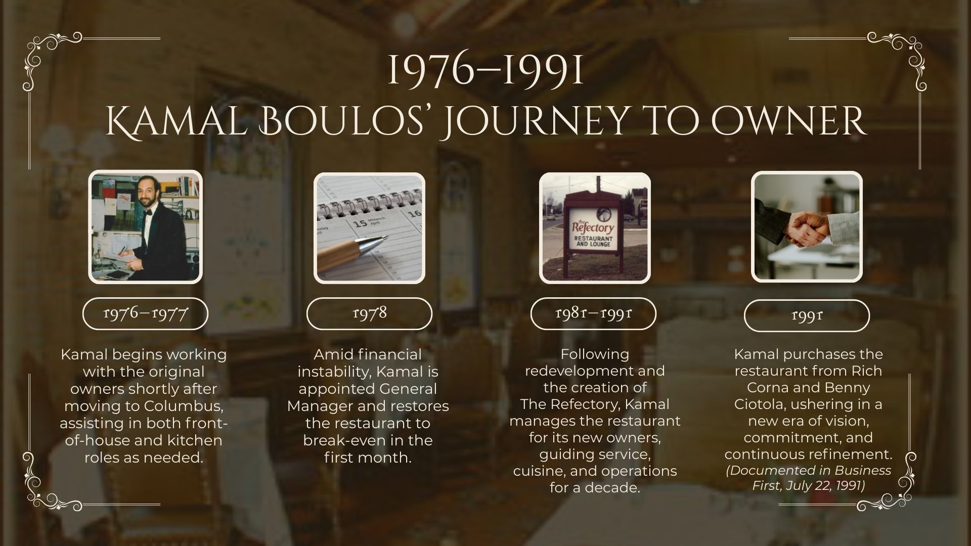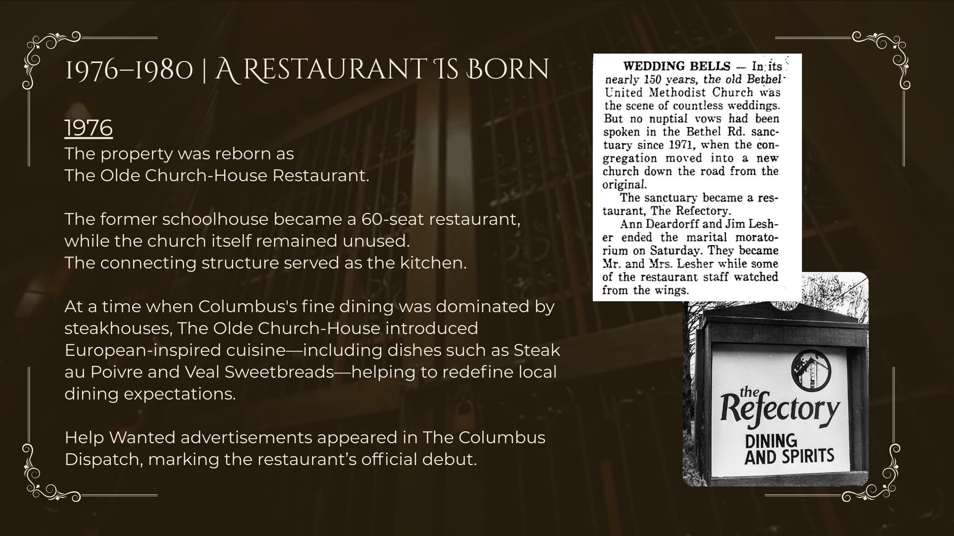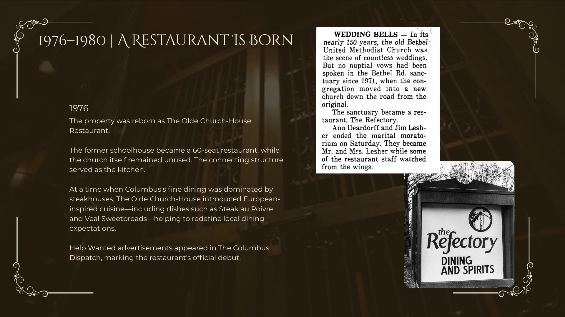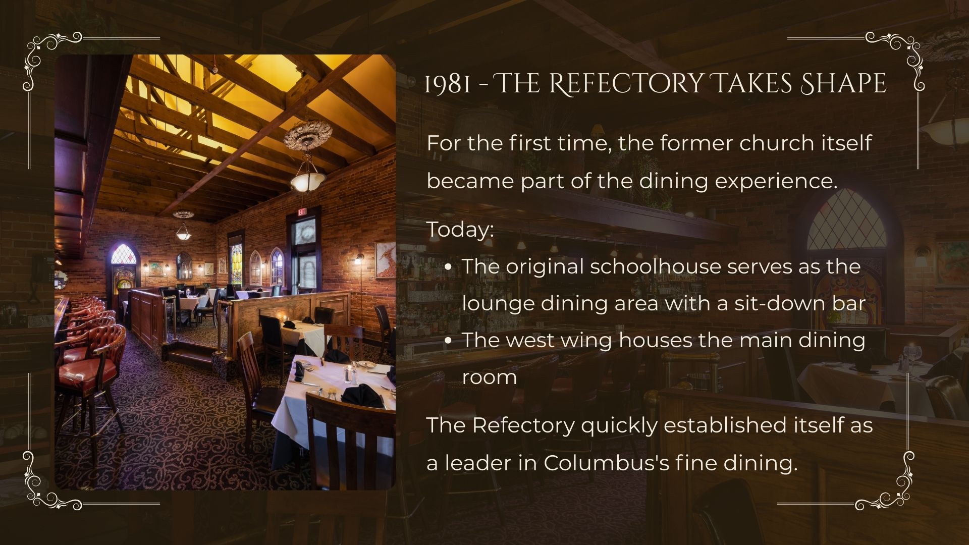 In 2026, The Refectory proudly marks fifty years of fine dining, gracious hospitality, and enduring tradition in Columbus.