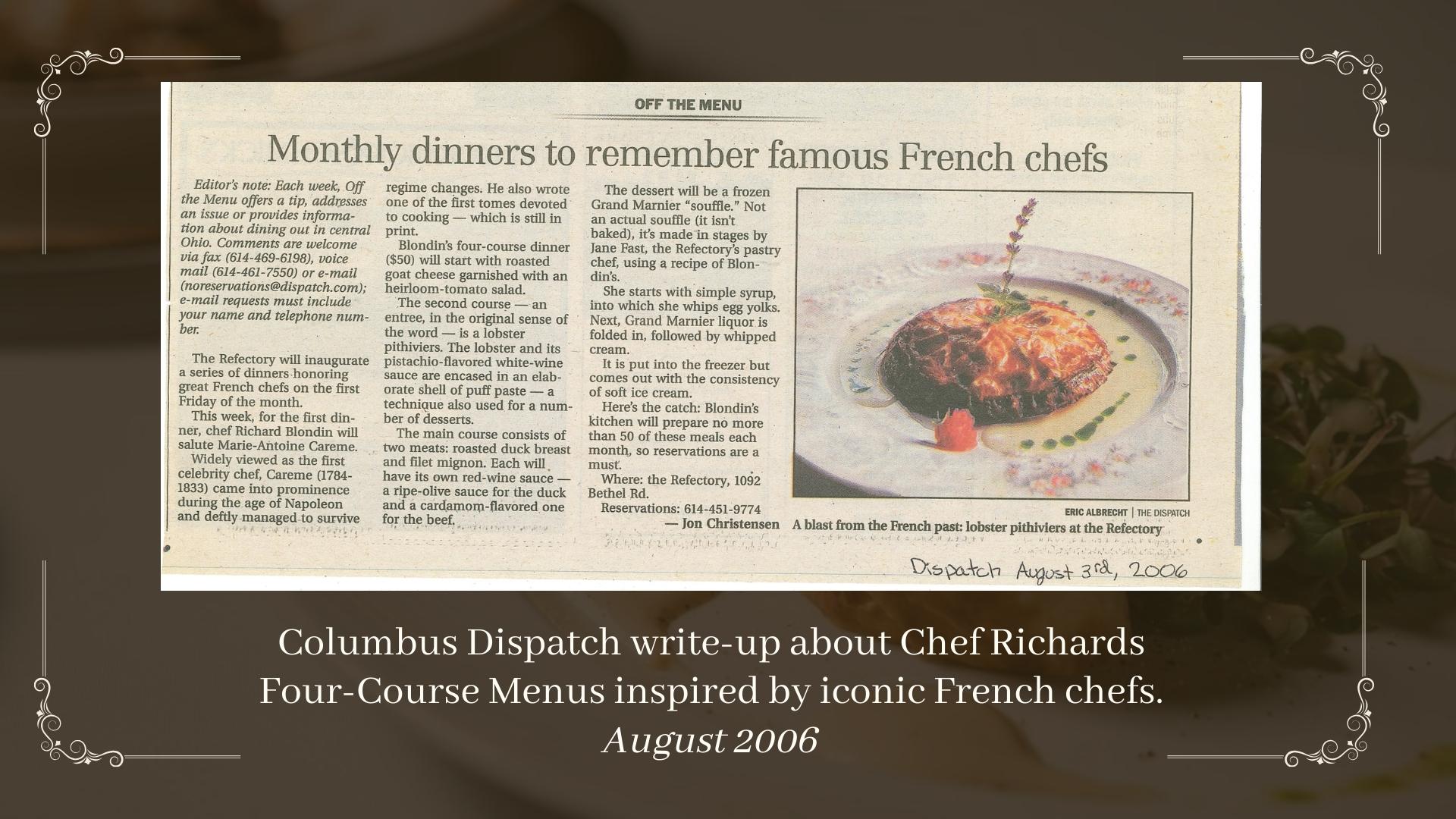 A lot has changed on the Columbus dining scene over those decades, but The Refectory’s reputation as the city’s finest dining option has not. Blondin’s impeccable French technique, masterful sauces and artistic presentation helped earn the restaurant a coveted trifecta of awards—Best Fine Dining, Best Romantic Restaurant and Best Wine List—in this year’s Best of Columbus reader poll in Columbus Alive (2014).