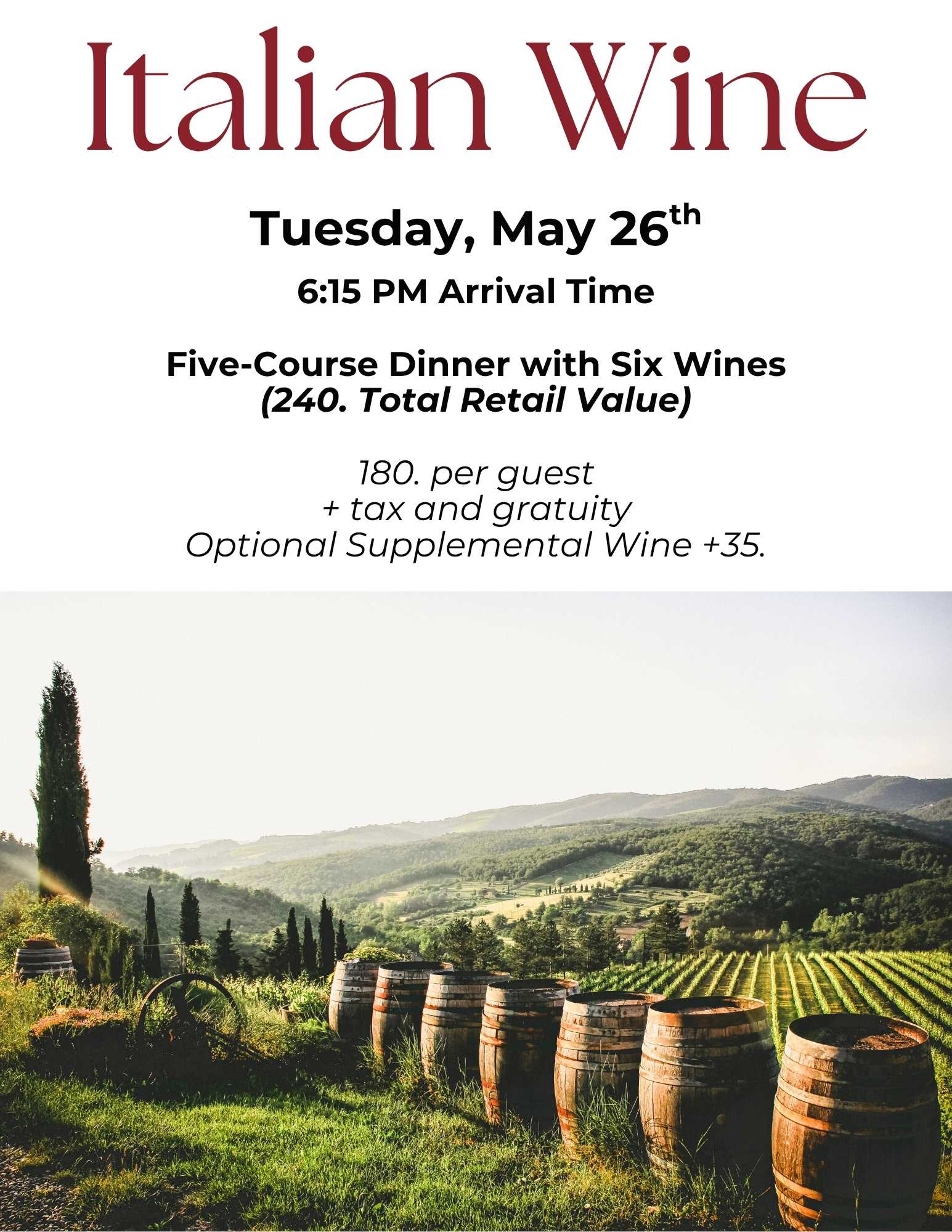 2 events found. Events Events Search and Views Navigation Search Enter Keyword. Search for Events by Keyword. Find Events Event Views Navigation List List Month Day Photo Week Map Today Upcoming Upcoming Select date. May 2026 Mon 4 Summer Vacation: Sounds of Italy, France, and Spain Mon May 4 @ 5:15 pm - 8:00 pm The Refectory Restaurant 1092 Bethel Rd., Columbus, OH, United States . . . Read More $150 Tue 26 Italian Wine Dinner Tue May 26 @ 6:15 pm - 8:30 pm . . . Read More $180 Previous Events Today Next Events Subscribe to calendar Google Calendar iCalendar Outlook 365 Outlook Live Export .ics file Export Outlook .ics file